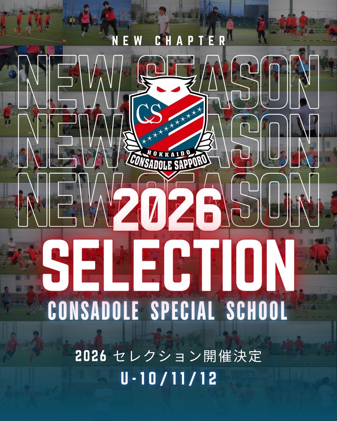 2026年度は新たに U-10(小学4年生)クラスを開校し、これまで同様に U-11・U-12(小学5・6年生) の選手も対象としてセレクションを開催いたします。